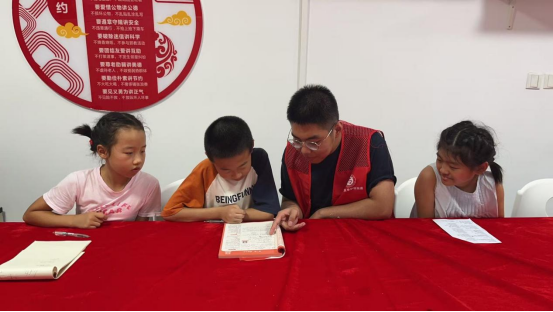 活动中,社区志愿者针对不同孩子们的学习特点,进行分层辅导,引导孩子们梳理学科知识,传授解题思路和学习方法,助力他们攻克暑假作业中的“拦路虎”。